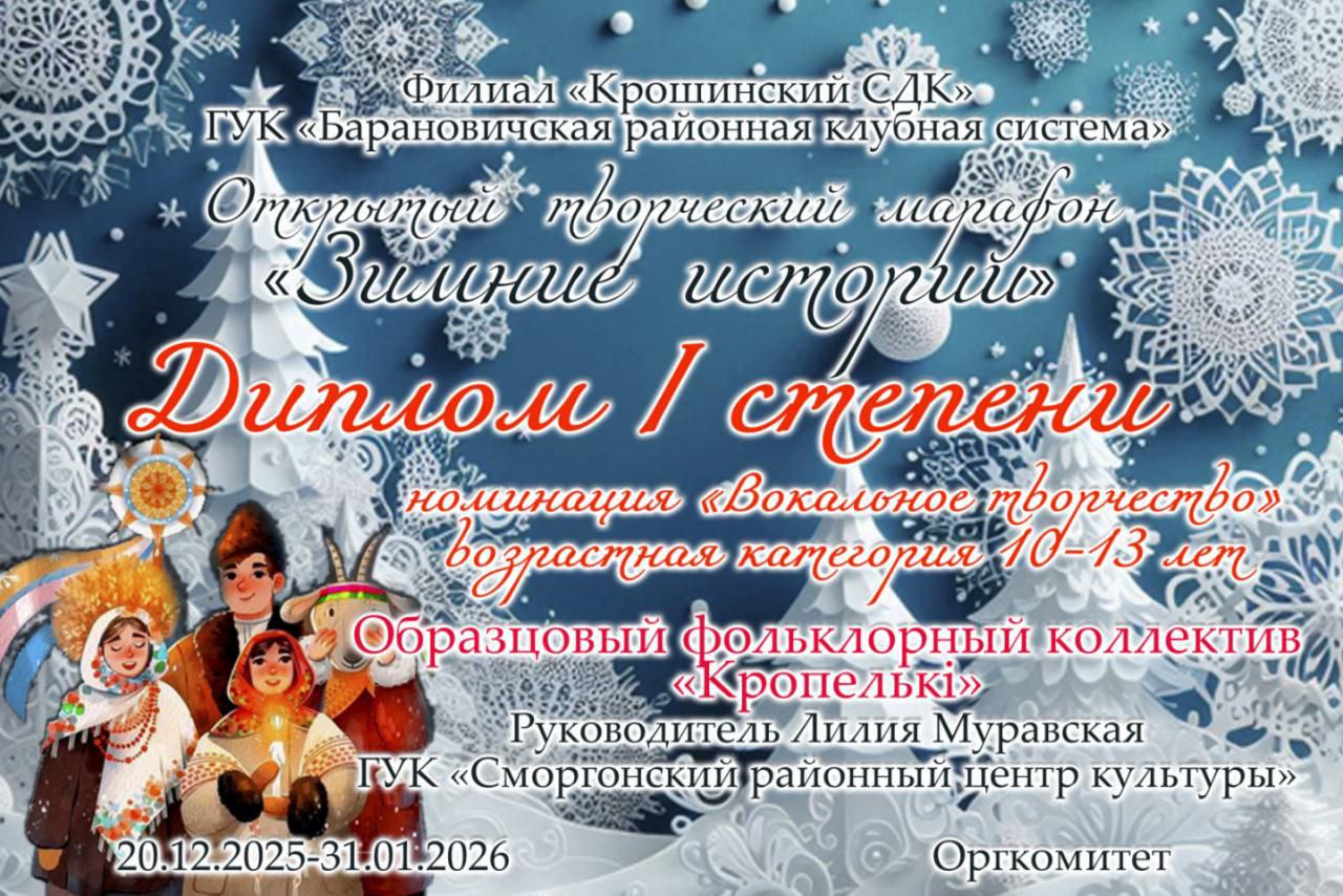 Образцовый фольклорный коллектив «Кропелькі» стал лауреатом I степени в номинации «Вокальное творчество» (возрастная категория 10–13 лет) на открытом творческом марафоне «Зимние истории»