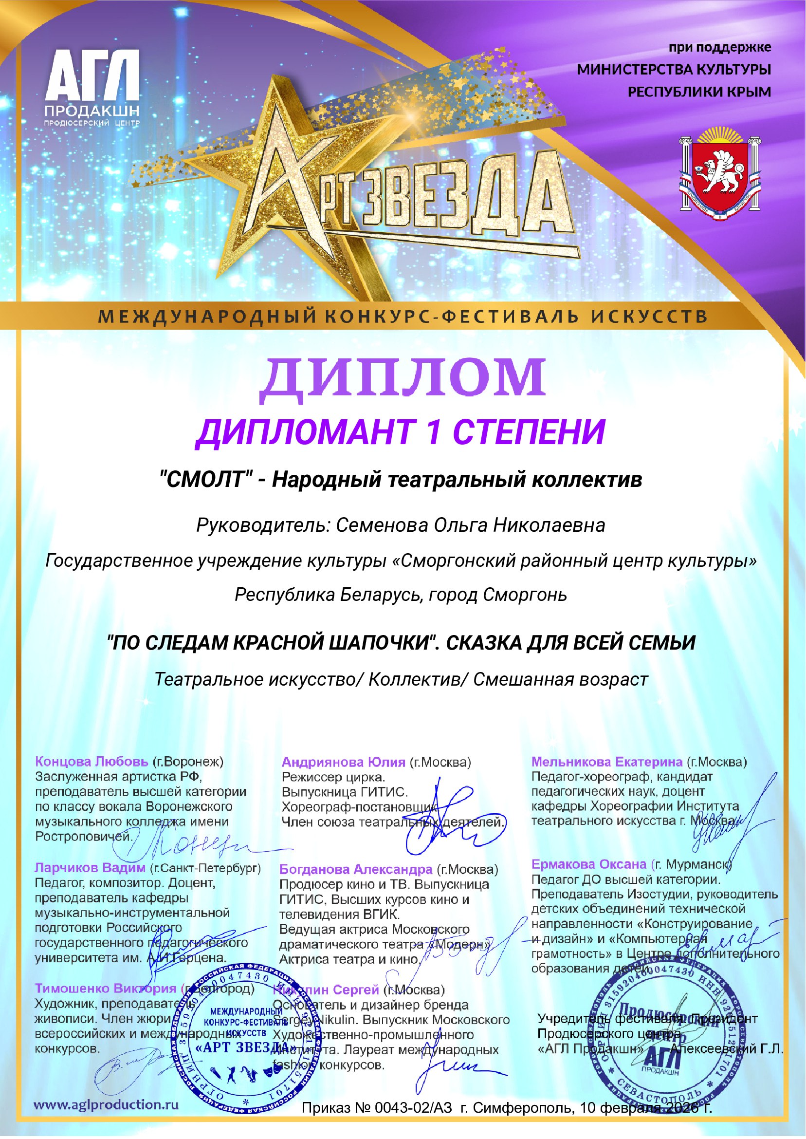 Народный театральный коллектив «СМОЛТ» ГУК «Сморгонский районный центр культуры» стал Дипломантом I степени Международного конкурса-фестиваля искусств «Арт-Звезда»