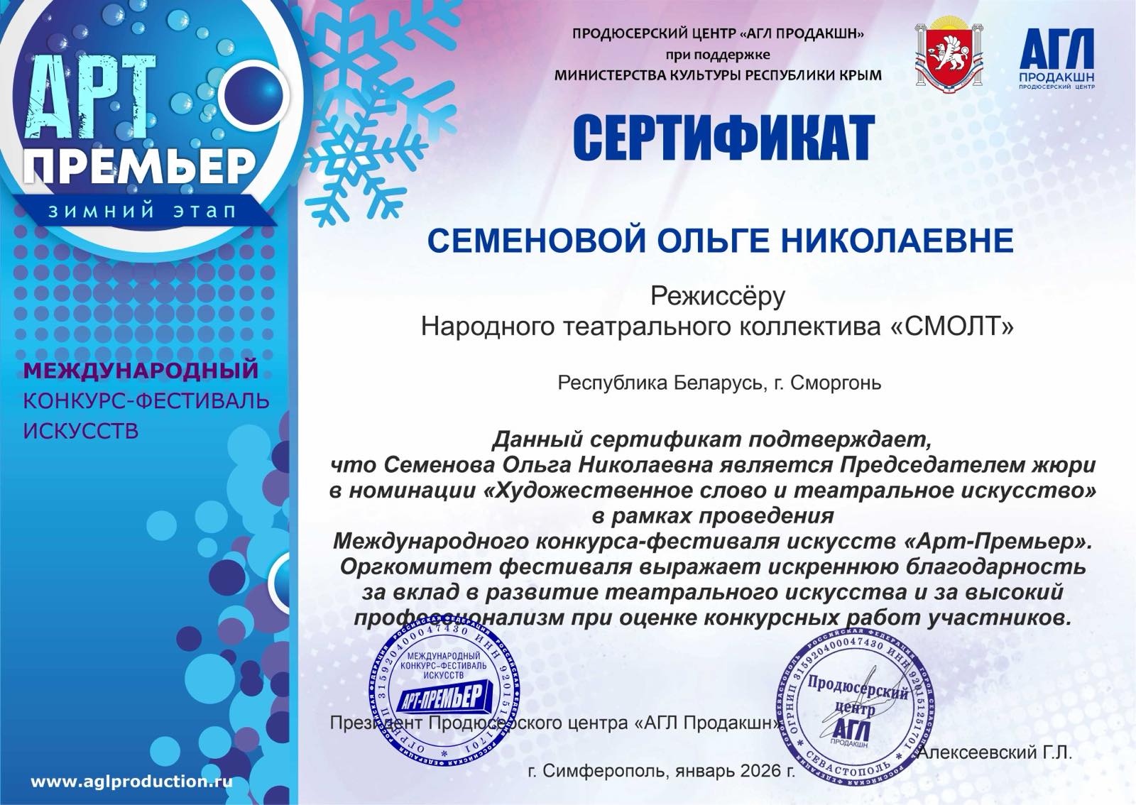 Также Семенова Ольга Николаевна отмечена Сертификатом Международного конкурса-фестиваля искусств «Арт-Премьер» (зимний этап) как Председатель жюри в номинации «Художественное слово и театральное искусство». Оргкомитет выразил благодарность за вклад в развитие театрального искусства и высокий профессионализм при оценке конкурсных работ.