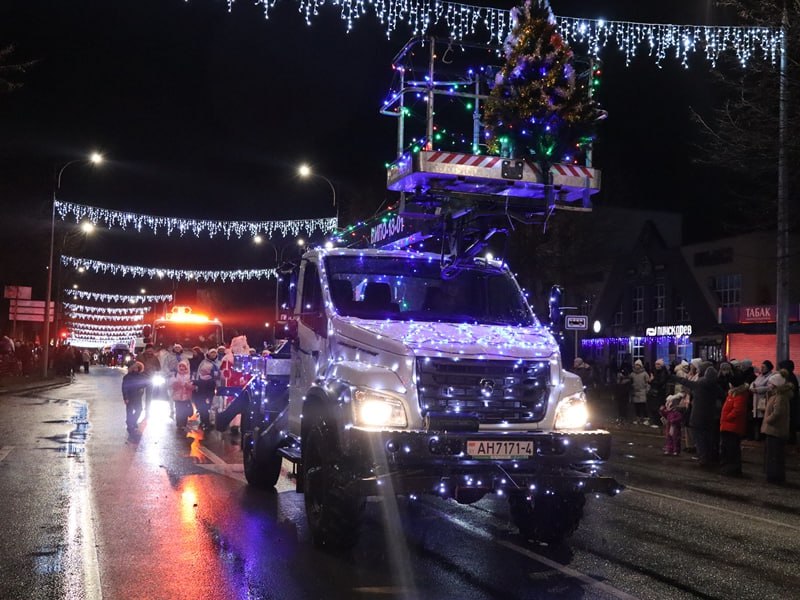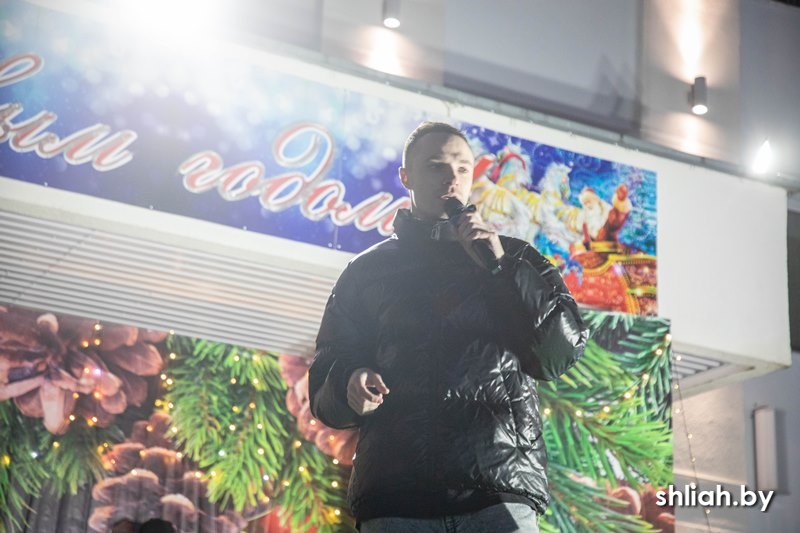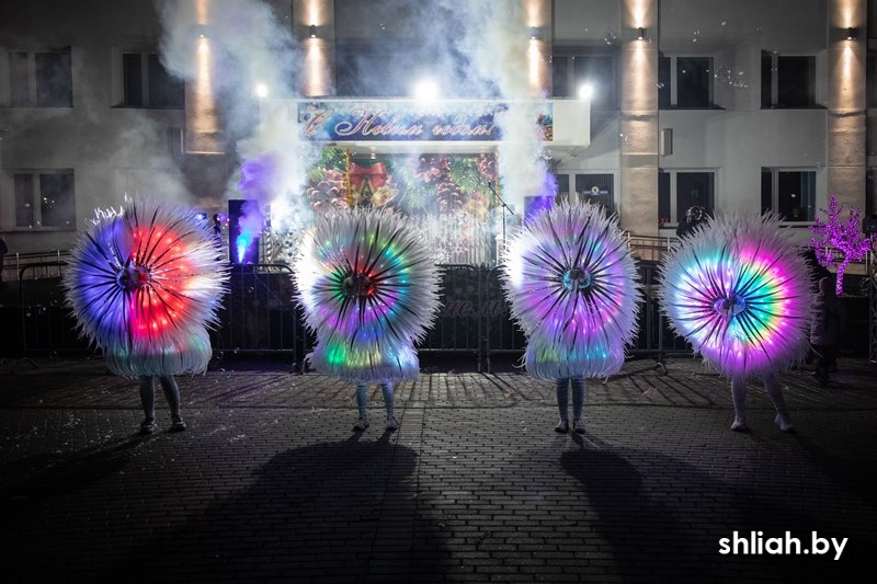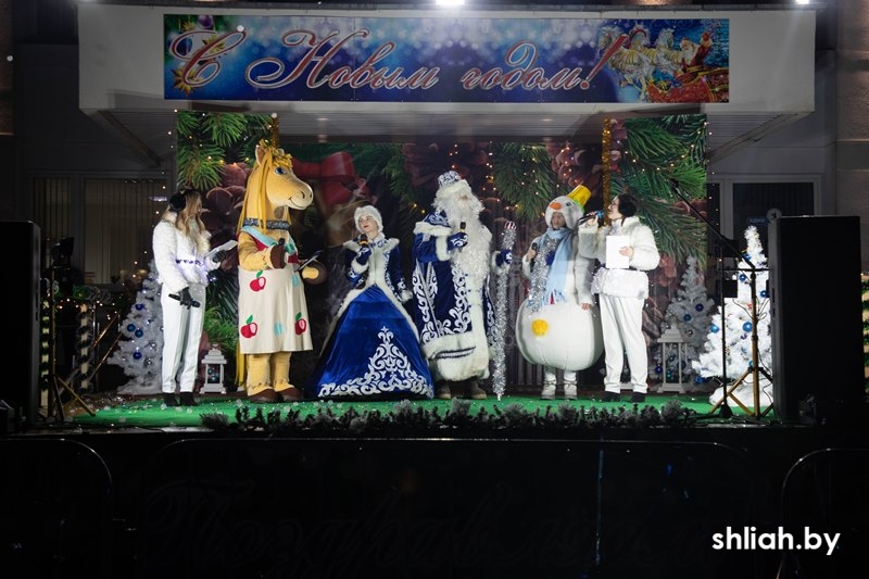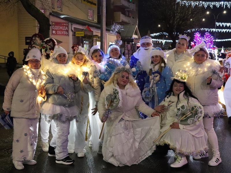 Под веселую музыку участники красочного шествия прошли по центральной улице Сморгони и собрали у городской новогодней ёлки горожан, где началась развлекательная программа