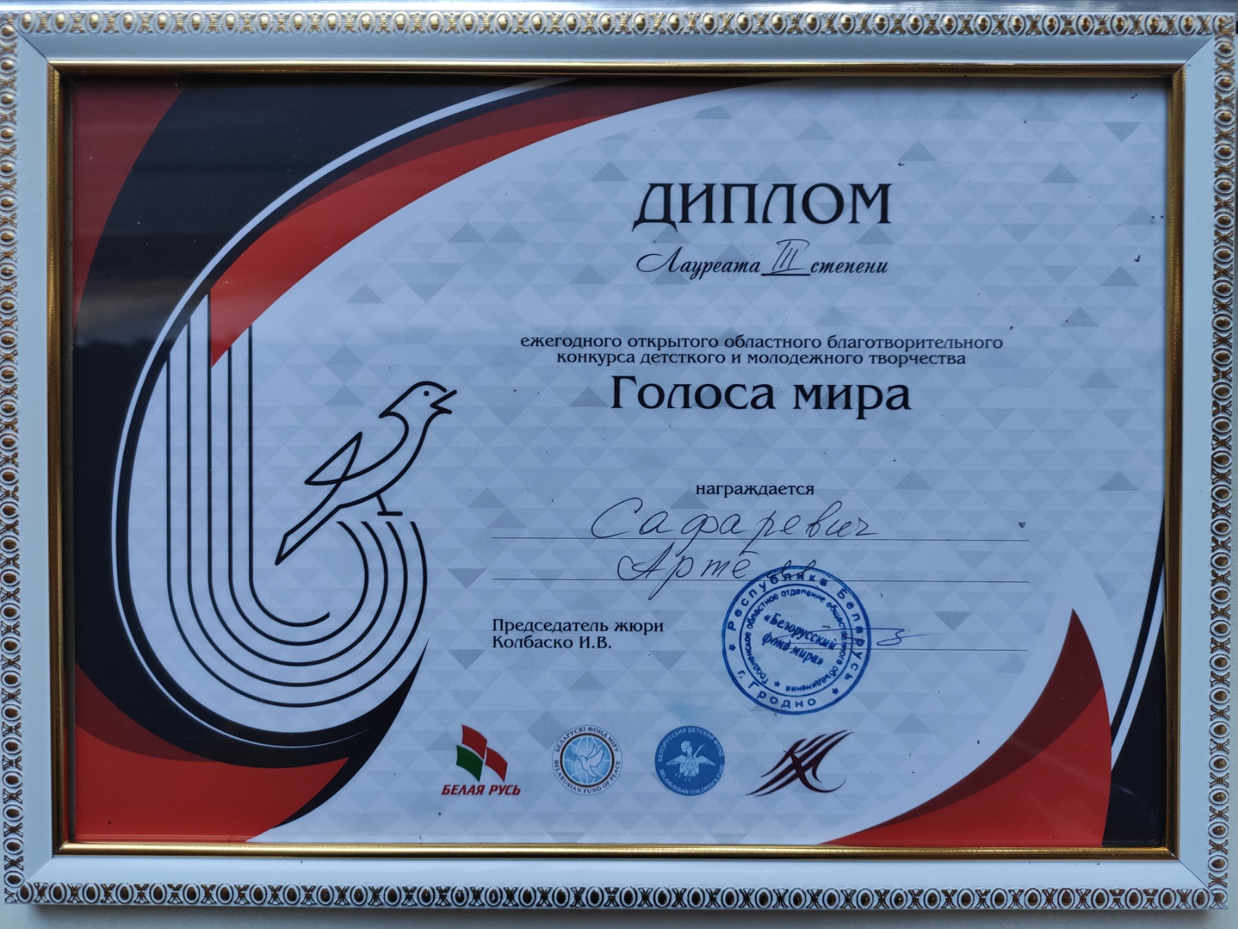 Дипломом III степени в ежегодном открытом областном благотворительном конкурсе детского и молодежного творчества «Голоса мира» награжден Артём Сарафович