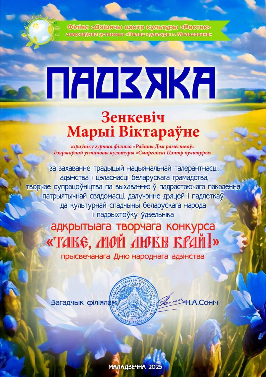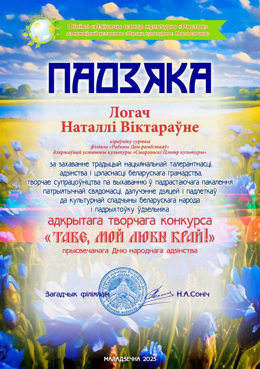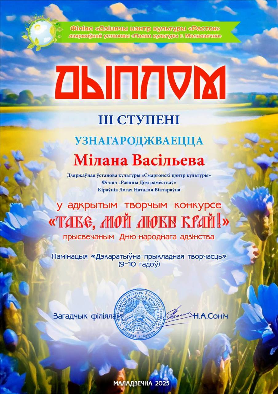 Дипломом III степени в открытом творческом конкурсе «Табе, мой любы край», посвященном Дню народного единства награждается Милана Васильевна (филиала «Районный Дом ремёсел»)