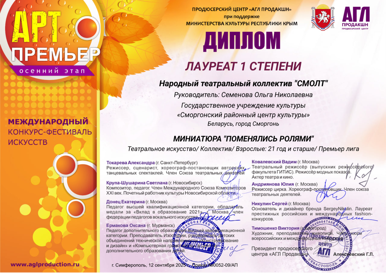 Дипломом лауреата I степени в Международном конкурсе-фестивале искусств «АРТ-ПРЕМЬЕР» награждается народный театральный коллектив «СМОЛТ» (ГУК «Сморгонский районный центр культуры»)