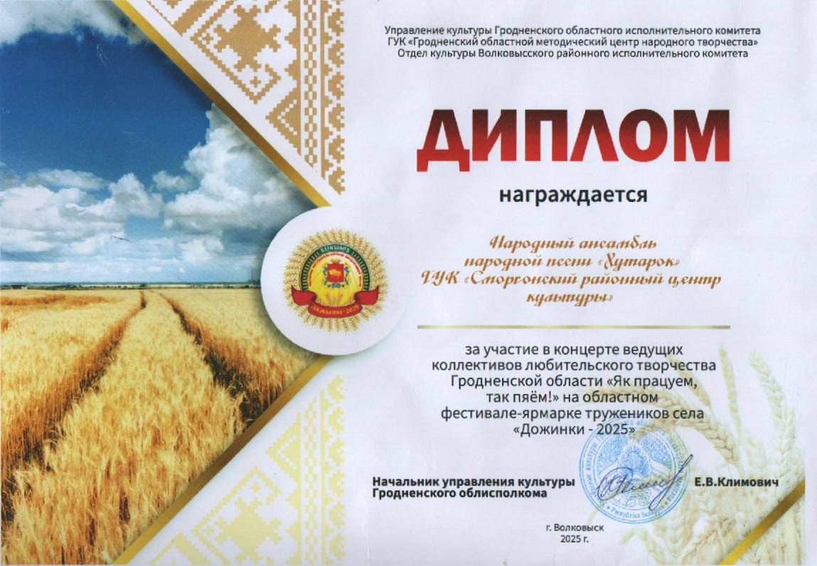 Дипломом за участие в в областном фестивале-ярмарке тружеников села «Дожинки – 2025» в городе Волковыск награжден народный ансамбль народной песни «Хутарок» (ГУК «Сморгонский районный центр культуры»)