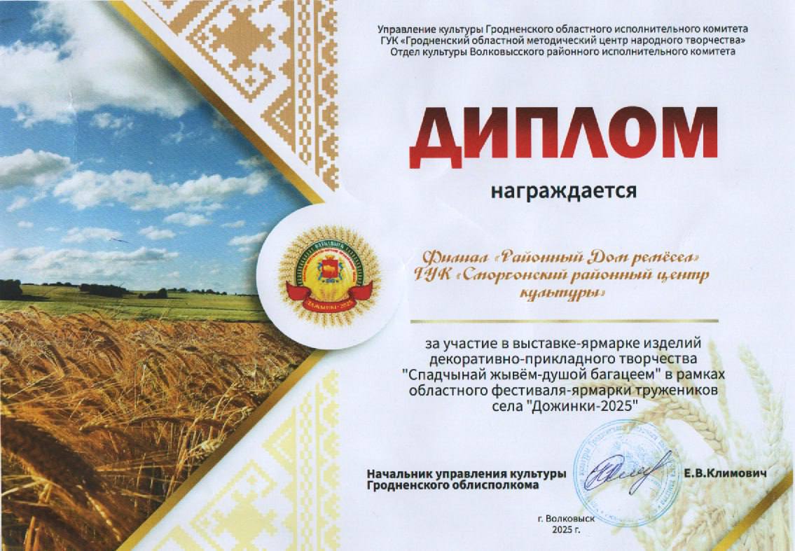 Дипломом за участие в в областном фестивале-ярмарке тружеников села «Дожинки – 2025» в городе Волковыск награжден филиал «Районный Дом ремёсел»