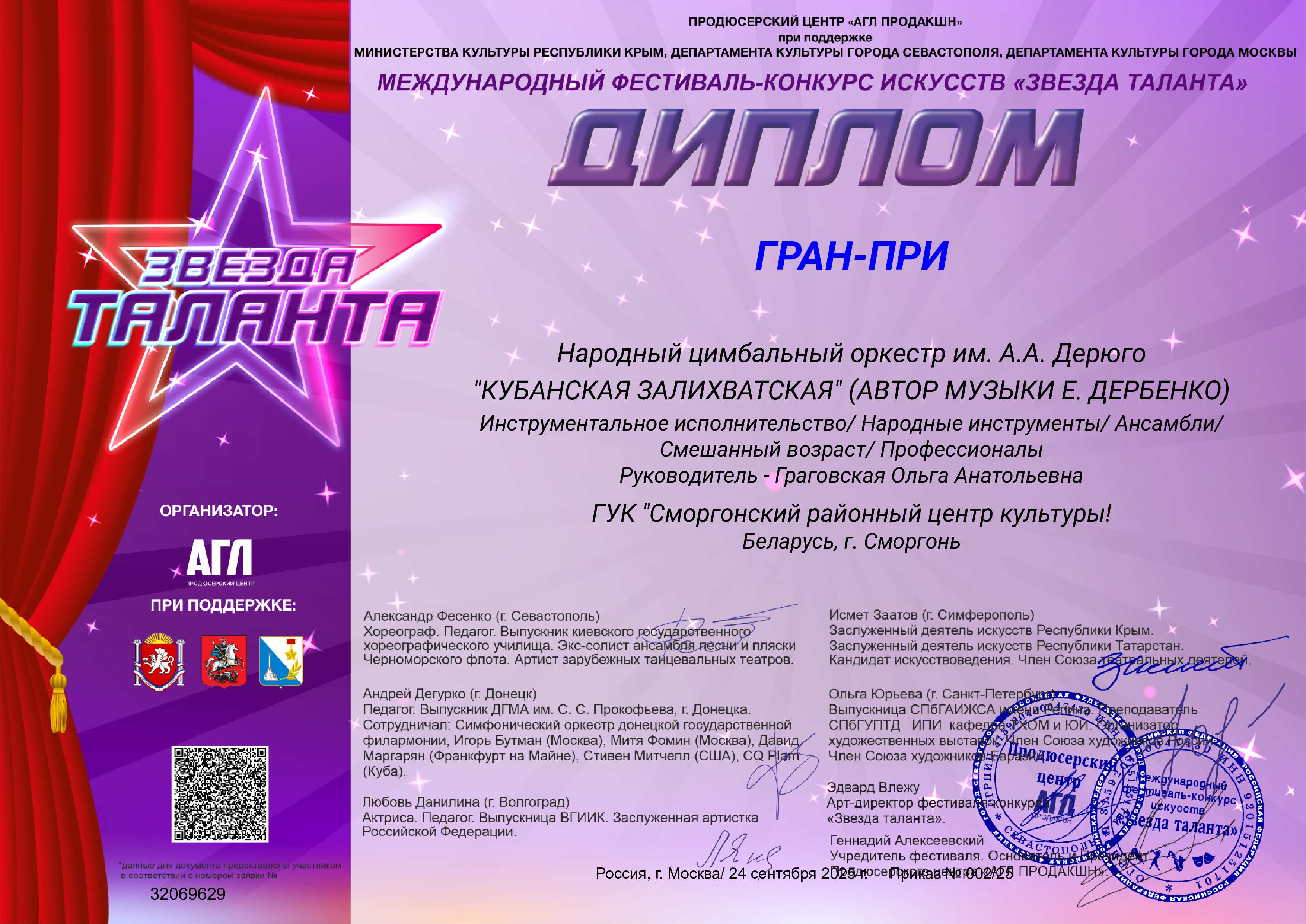 ГРАН-ПРИ фестиваля-конкурса взял народный цимбальный оркестр им. А.А. Дерюго в Международном фестивале-конкурсе искусств «Звезда таланта»
