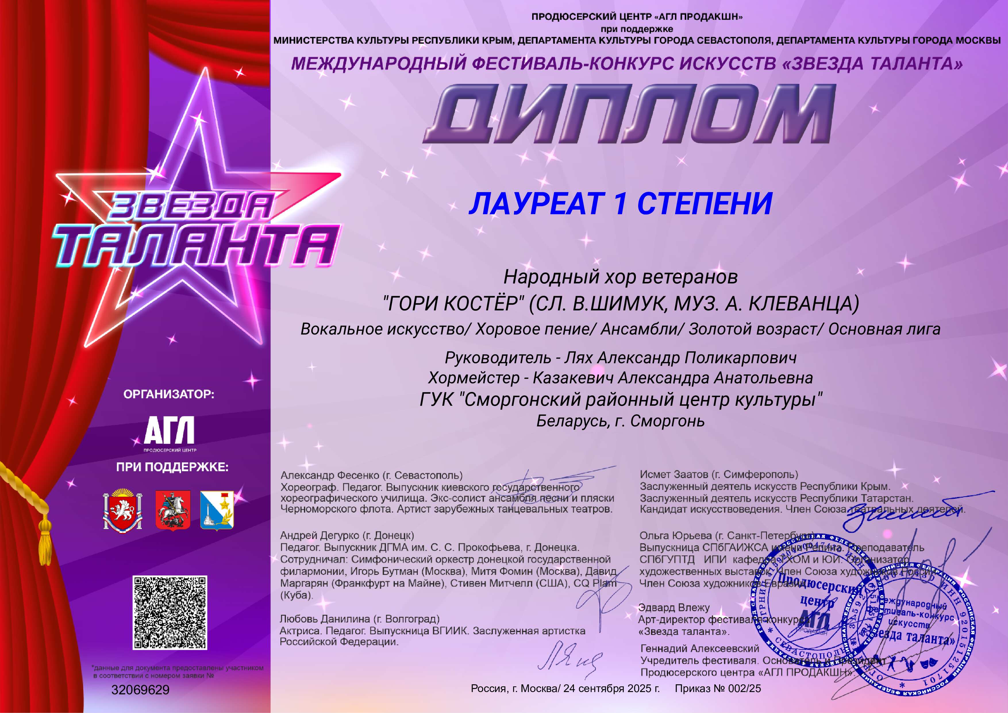 Диплом лауреата I степени получил народный хор ветеранов в Международном фестивале-конкурсе искусств «Звезда таланта»