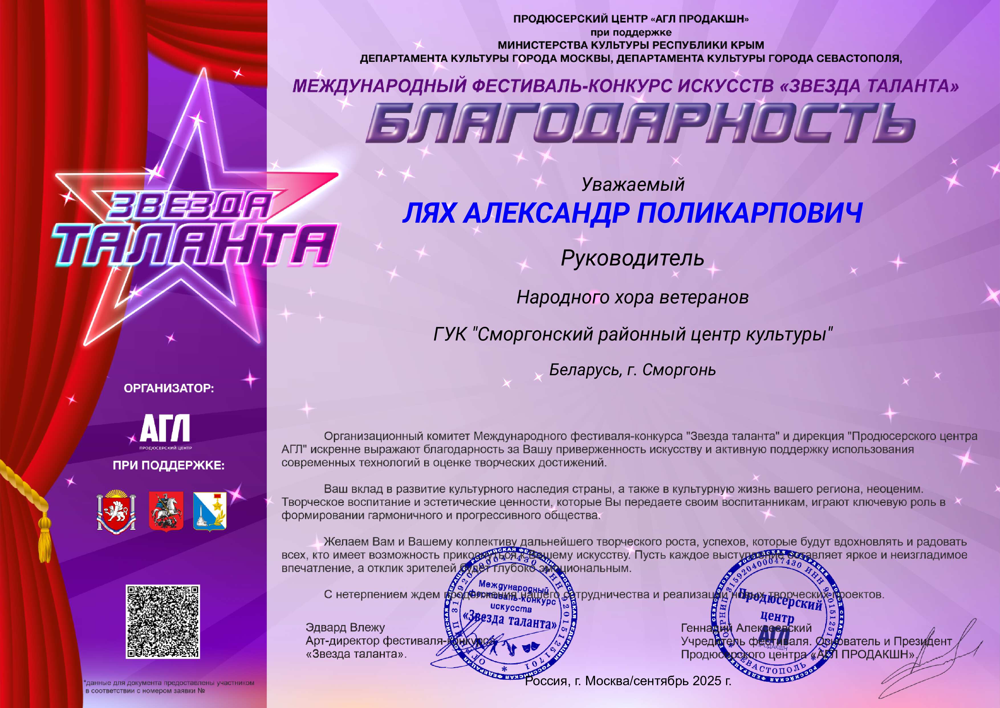Народный хор ветеранов государственного учреждения культуры «Сморгонский районный центр культуры» стал обладателем Гран-при II Международного фестиваля-конкурса творчества "Пирамида ЗВЁЗД"(г.Минск), в номинации «Хоровое искусство», который прошёл в онлайн-режиме.