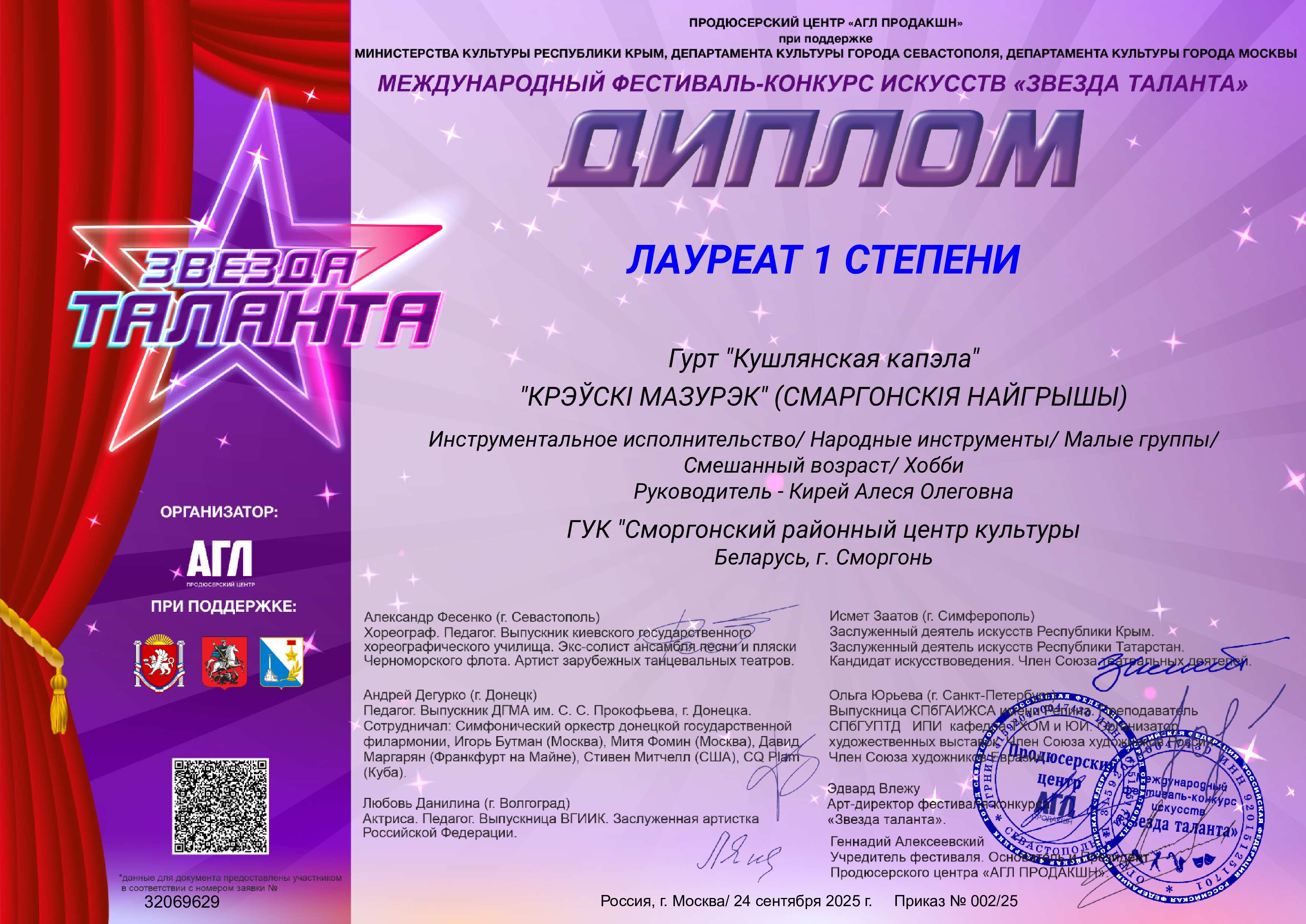 Дипломом лауреата II степени III Международного конкурса искусств «КУПАЛЬСКАЯ ЗОРКА» награждён квартет «Кушлянская капелла» ГУК «Сморгонский районный центр культуры» в номинации: инструментальное искусство (смешанные ансамбли и оркестры)