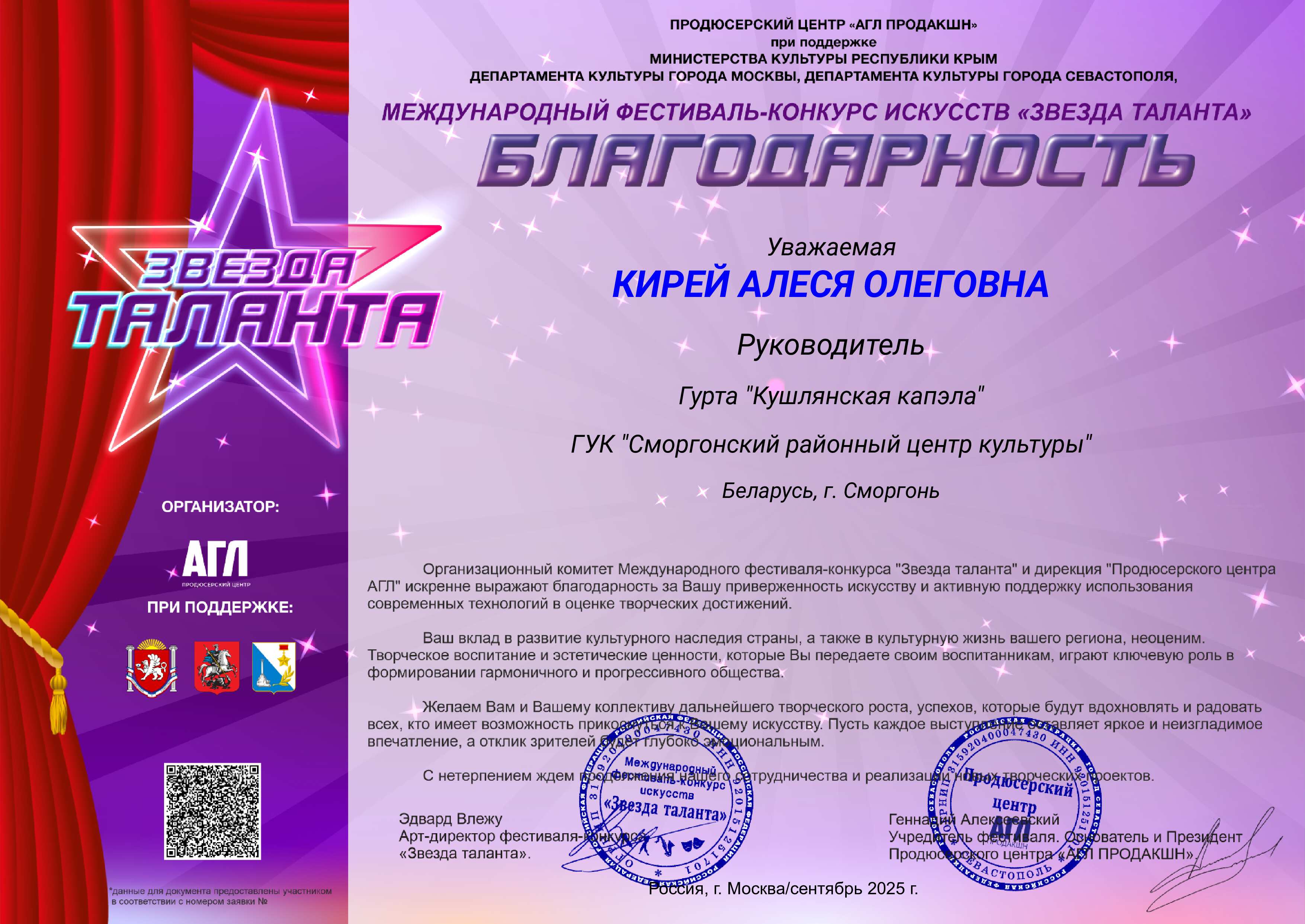 Дипломом лауреата I степени награждён гурт «Кушлянская капэла» в Международном фестивале-конкурсе искусств «Звезда таланта»