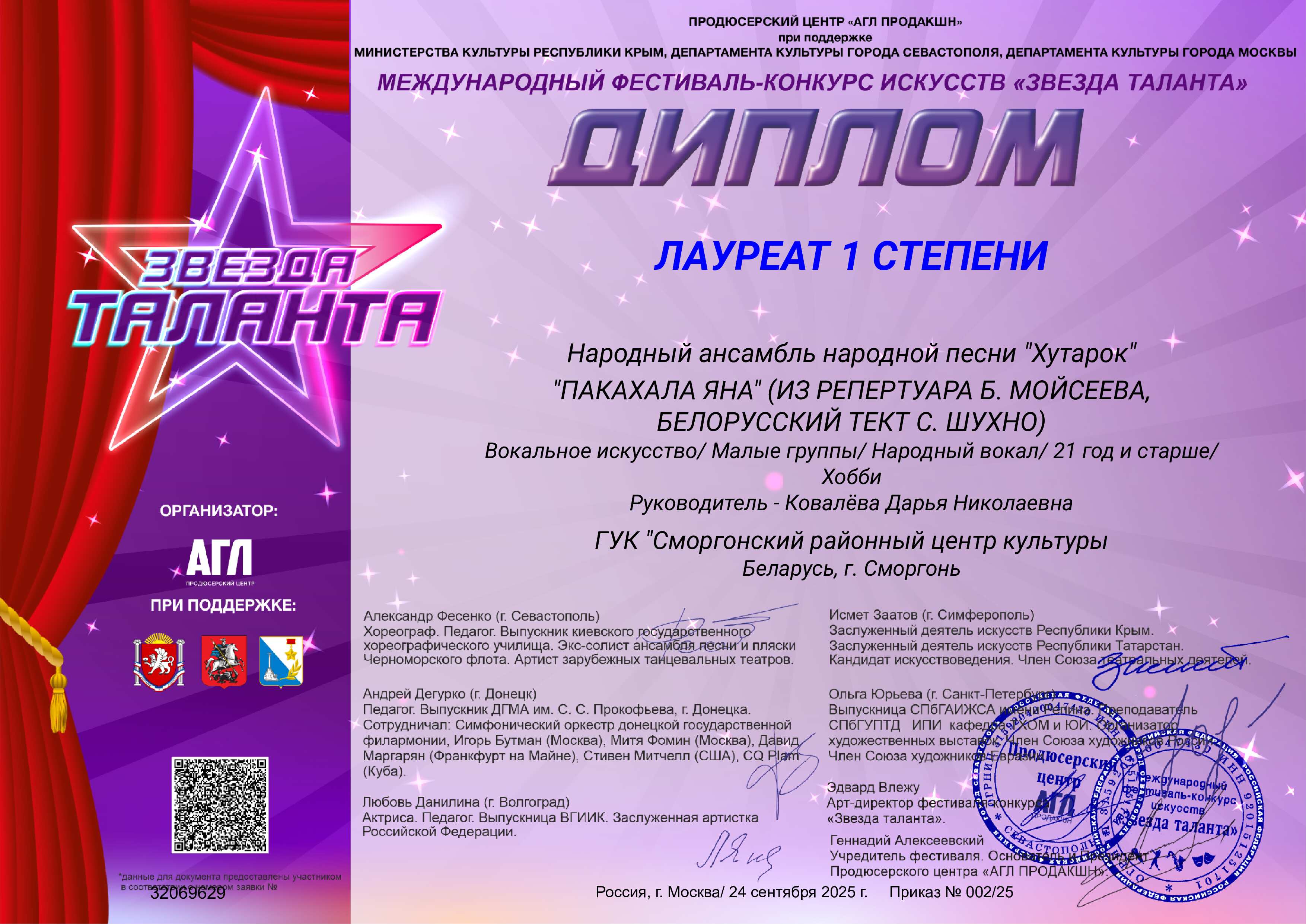Дипломом лауреата I степени в международном фестивале-конкурсе искусств «Звезда таланта» награждается образцовый фольклорный коллектив «Кропелькі»