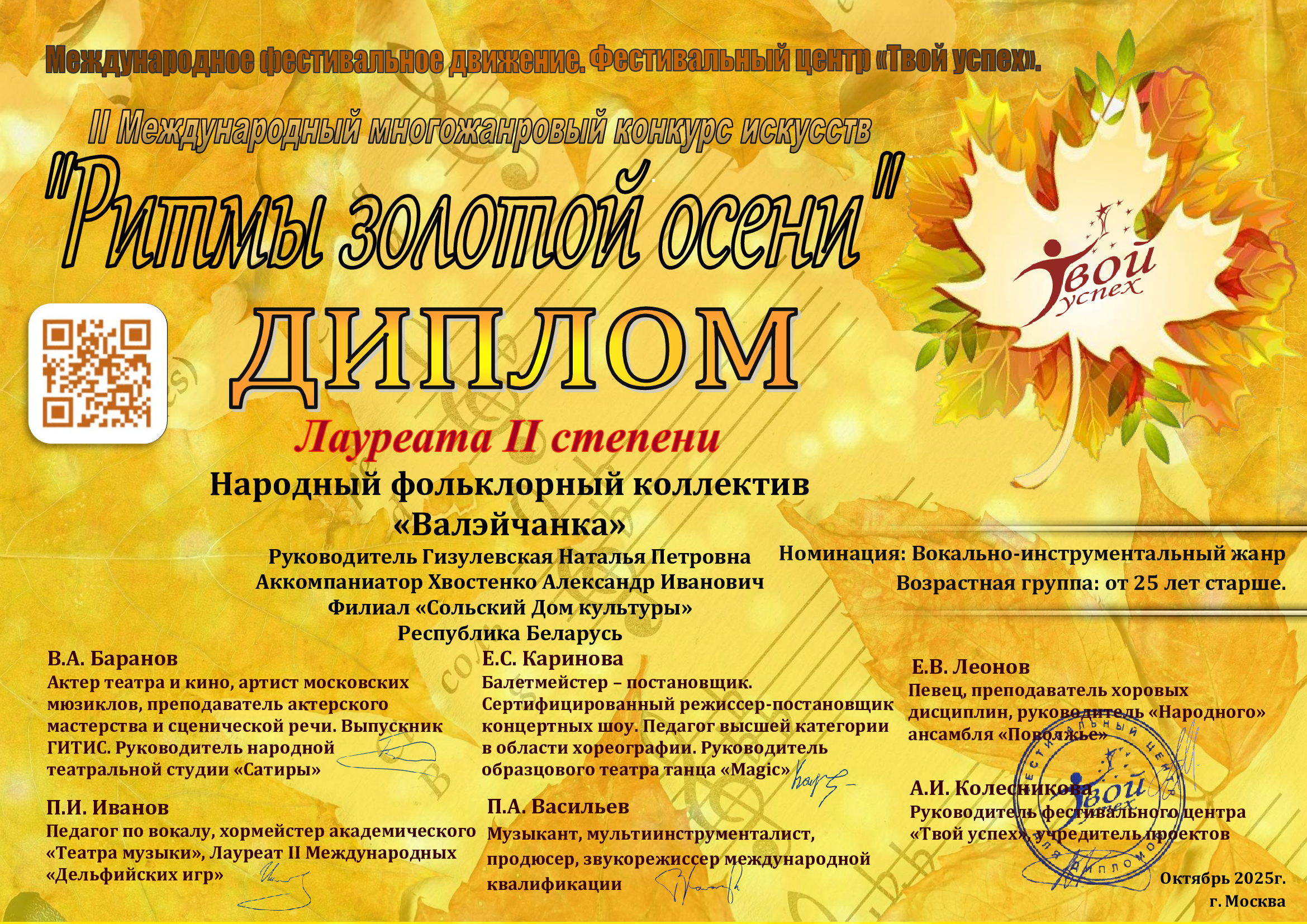 Народный фольклорный коллектив «Валэйчанка» стал лауреатом II степени а II Международном многожанровом конкурсе искусств «Ритмы золотой осени» в номинации «Вокально-инструментальный жанр» (возрастная категория — от 25 лет и старше).