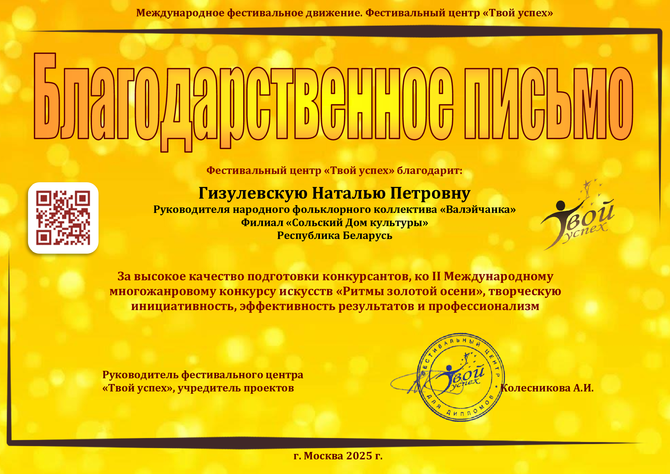 За высокий уровень подготовки участников, творческую инициативность и профессионализм руководитель коллектива Наталья Петровна Гизулевская и аккомпаниатор Александр Иванович Хвостенко отмечены благодарственными письмами фестивального центра «Твой успех».