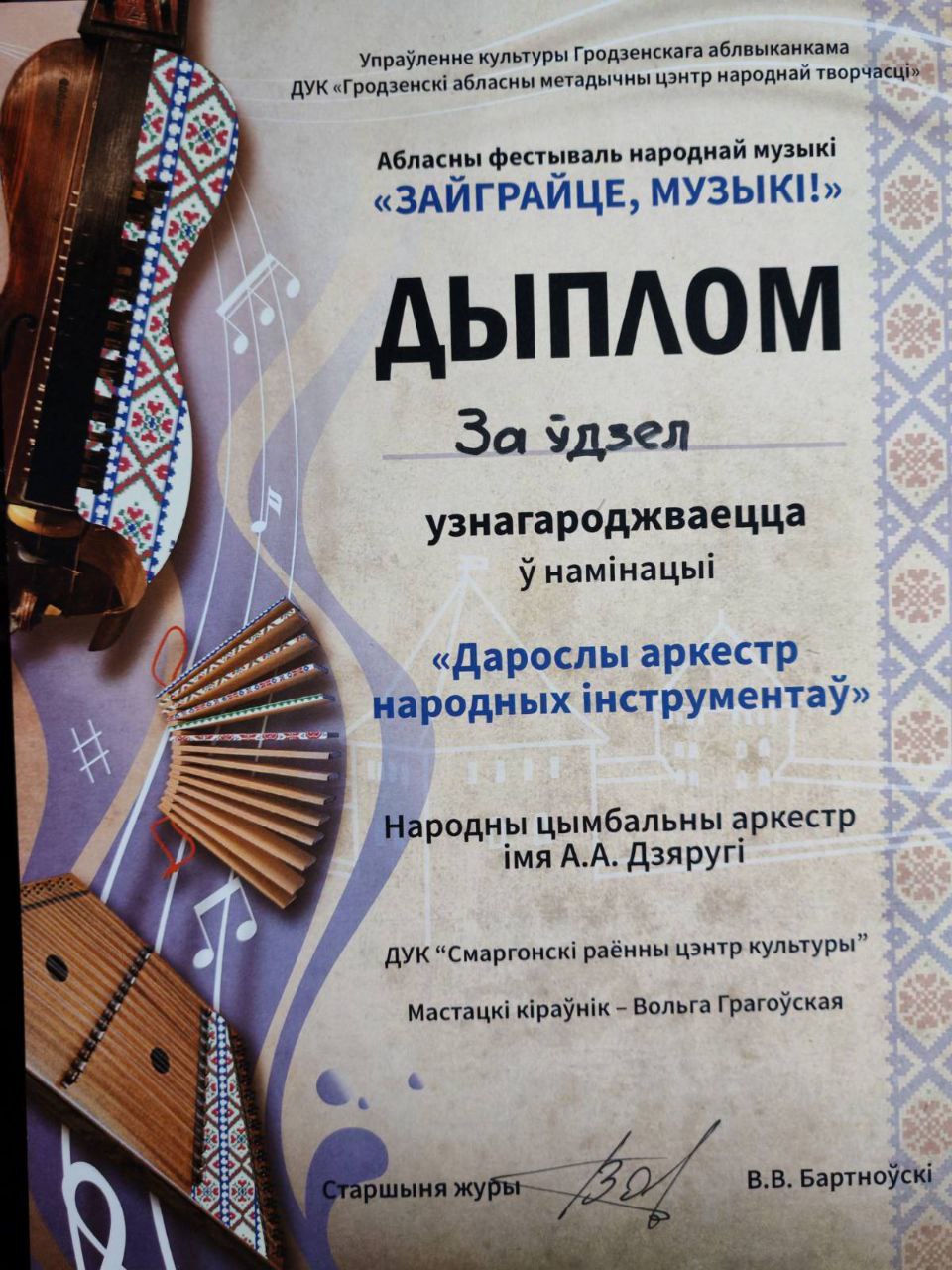 Дипломом "За участие" в областном фестивале народной музыки «Зайграйце, музыкі!» был награжден народный цимбальный оркестр им. А. А. Дерюго ГУК "Сморгонский районный центр культуры" в номинации "Дарослы аркестр народных інструментаў".