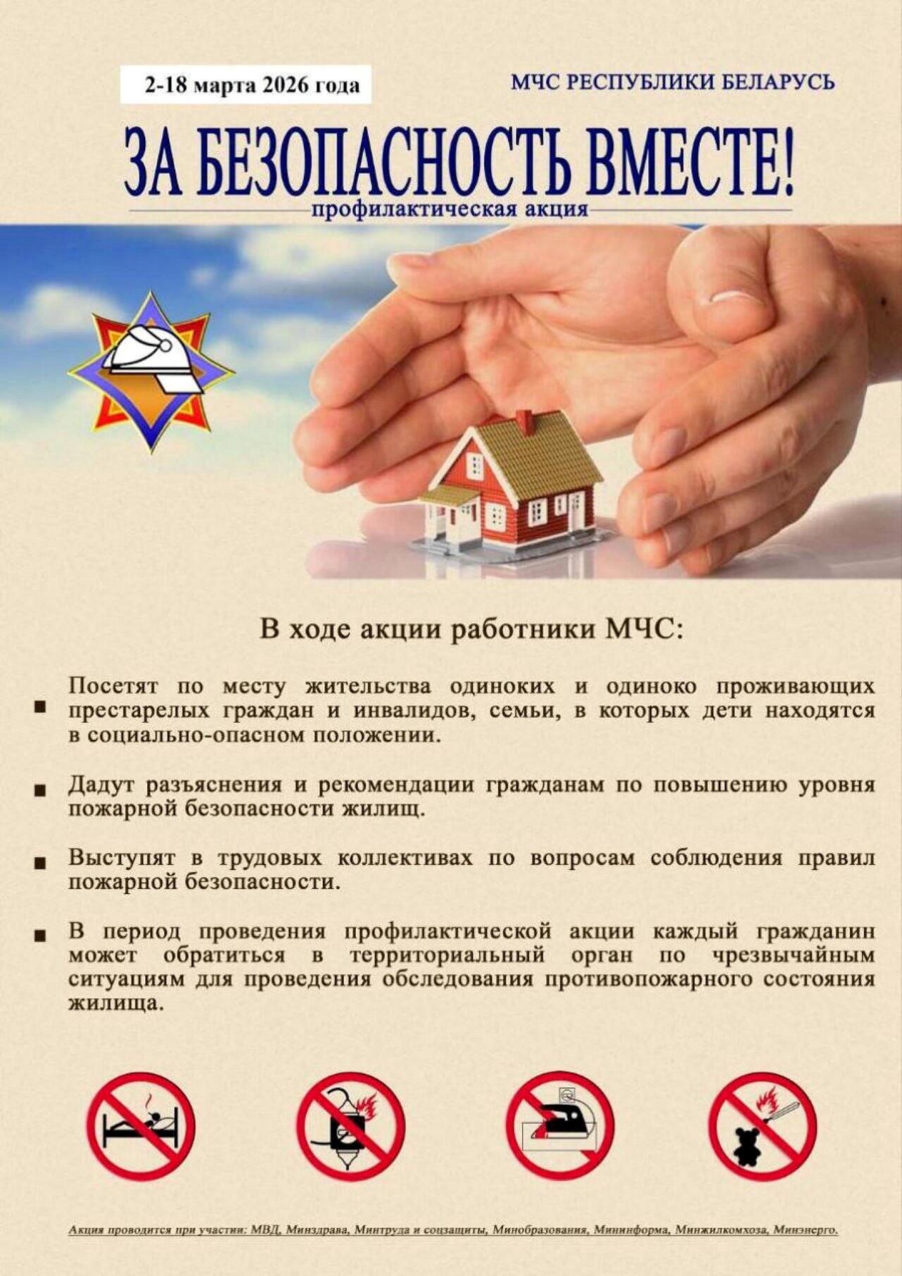 Республиканская профилактическая акция «За безопасность вместе» проходит в Беларуси в период со 2 по 18 марта 2026 года. Основная цель — повышение культуры безопасности жизнедеятельности населения и снижение количества пожаров, происходящих из-за несоблюдения правил пожарной безопасности в жилом фонде.